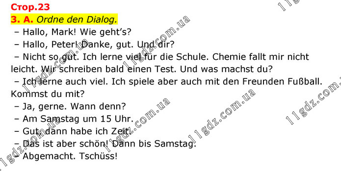 Стор.23 3. A. Ordne den Dialog. – Hallo, Mark! Wie geht’s? – Hallo, Peter! Danke, gut. Und dir? – Nicht so gut. Ich lerne viel für die Schule. Chemie fallt mir nicht leicht. Wir schreiben bald einen Test. Und was machst du? – Ich lerne auch viel. Ich spiele aber auch mit den Freunden Fußball. Kommst du mit? – Ja, gerne. Wann denn? – Am Samstag um 15 Uhr. – Gut, dann habe ich Zeit. – Das ist aber schön! Dann bis Samstag. – Abgemacht. Tschüss!