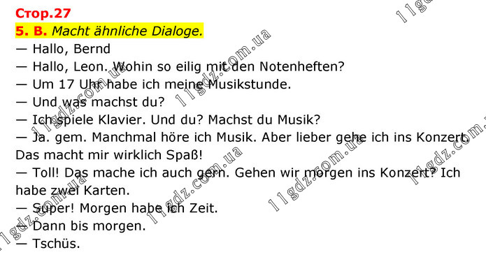 Стор.27 5. B. Macht ähnliche Dialoge. — Hallo, Bernd — Hallo, Leon. Wohin so eilig mit den Notenheften? — Um 17 Uhr habe ich meine Musikstunde. — Und was machst du? — Ich spiele Klavier. Und du? Machst du Musik? — Ja. gem. Manchmal höre ich Musik. Aber lieber gehe ich ins Konzert. Das macht mir wirklich Spaß! — Toll! Das mache ich auch gern. Gehen wir morgen ins Konzert? Ich habe zwei Karten. — Super! Morgen habe ich Zeit. — Dann bis morgen. — Tschüs.