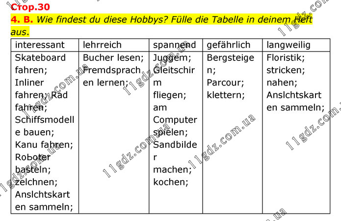 Стор.30 4. B. Wie findest du diese Hobbys? Fülle die Tabelle in deinem Heft aus. interessant lehrreich spannend gefährlich langweilig Skateboard fahren; Inliner fahren; Rad fahren; Schiffsmodelle bauen; Kanu fahren; RoЬoter basteln; zelchnen; Anslchtskarten sammeln; Bucher lesen; Fremdsprachen lernen; Juggem; Gleitschirm fliegen; am Computer spielen; Sandbilder machen; kochen; Bergsteigen; Parcour; klettern; Floristik; stricken; nahen; Anslchtskarten sammeln;