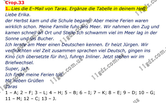 Стор.33 1. Lies die E–Mail von Taras. Ergänze die Tabelle in deinem Heft. Liebe Erika. der Herbst kam und die Schule begann. Aber meine Ferien waren wirklich schon. Meine Familie fuhr ans Meer. Wir nahmen den Zug und kamen schnell an Ort und Stelle Ich schwamm viel im Meer lag in der Sonne und las Bucher. Ich lernte am Meer einen Deutschen kennen. Er heizt Jürgen. Wir verbrachten viel Zeit zusammen sprachen viel Deutsch, gingen ins Kino (ich übersetzte für ihn), fuhren Inliner. Jetzt stehen wir im Briefwechsel. Super, ja? Ich finde meine Ferien toll. Mit lieben Grüßen Taras 1 – A; 2 – F; 3 – L; 4 – H; 5 – B; 6 – I; 7 – K; 8 – E; 9 – D; 10 – G; 11 – M; 12 – C; 13 – J.