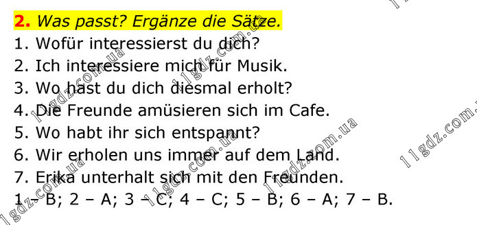 2. Was passt? Ergänze die Sätze. 1. Wofür interessierst du dich? 2. Ich interessiere mich für Musik. 3. Wo hast du dich diesmal erholt? 4. Die Freunde amüsieren sich im Cafe. 5. Wo habt ihr sich entspannt? 6. Wir erholen uns immer auf dem Land. 7. Erika unterhalt sich mit den Freunden. 1 – B; 2 – A; 3 – C; 4 – C; 5 – B; 6 – A; 7 – B.