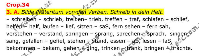 Стор.34 3. A. Bilde Präteritum von den Verben. Schreib in dein Heft. – schreiben – schrieb, treiben– trieb, treffen – traf, schlafen – schlief, helfen – half, laufen – lief, sitzen – saS, fern sehen – fern sah, verstehen – verstand, springen – sprang, sprechen – sprach, singen – sang, gefallen – gefiel, stehen – stand, essen – aS, lesen – laS, bekommen – bekam, gehen – ging, trinken – trank, bringen – brachte.