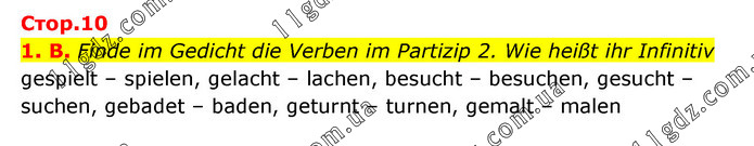 Стор.10 1. B. Finde im Gedicht die Verben im Partizip 2. Wie heißt ihr Infinitiv gespielt – spielen, gelacht – lachen, besucht – besuchen, gesucht – suchen, gebadet – baden, geturnt – turnen, gemalt – malen