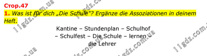 Стор.47 1. Was ist für dich „Die Schule"? Ergänze die Assoziationen in deinem Heft. Kantine – Stundenplan – Schulhof – Schulfest – Die Schule – lernen – die Lehrer