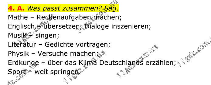 4. A. Was passt zusammen? Sag. Mathe – Rechenaufgaben machen; Englisch – übersetzen, Dialoge inszenieren; Musik – singen; Literatur – Gedichte vortragen; Physik – Versuche machen; Erdkunde – über das Klima Deutschlands erzählen; Sport – weit springen.