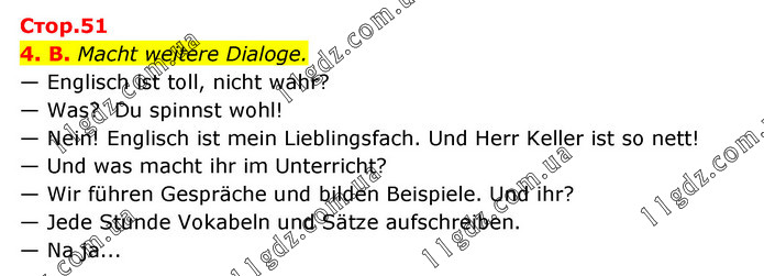 Стор.51 4. B. Macht weitere Dialoge. — Englisch ist toll, nicht wahr? — Was? Du spinnst wohl! — Nein! Englisch ist mein Lieblingsfach. Und Herr Keller ist so nett! — Und was macht ihr im Unterricht? — Wir führen Gespräche und bilden Beispiele. Und ihr? — Jede Stunde Vokabeln und Sätze aufschreiben. — Na ja...