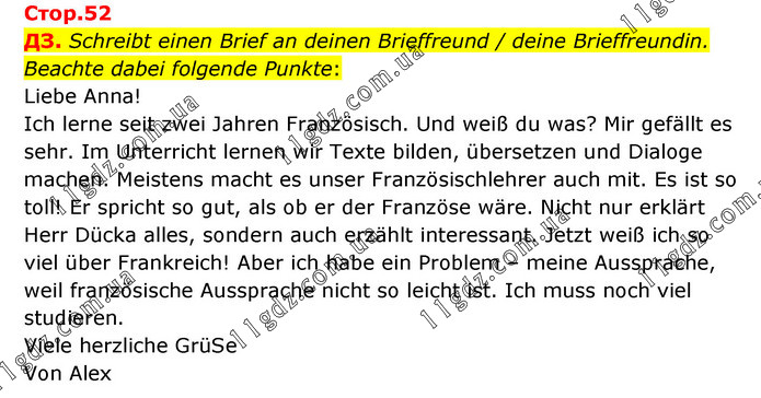 Стор.52 ДЗ. Schreibt einen Brief an deinen Brieffreund / deine Brieffreundin. Beachte dabei folgende Punkte: Liebe Anna! Ich lerne seit zwei Jahren Französisch. Und weiß du was? Mir gefällt es sehr. Im Unterricht lernen wir Texte bilden, übersetzen und Dialoge machen. Meistens macht es unser Französischlehrer auch mit. Es ist so toll! Er spricht so gut, als ob er der Französe wäre. Nicht nur erklärt Herr Dücka alles, sondern auch erzählt interessant. Jetzt weiß ich so viel über Frankreich! Aber ich habe ein Problem – meine Aussprache, weil französische Aussprache nicht so leicht ist. Ich muss noch viel studieren. Viele herzliche GrüSe Von Alex