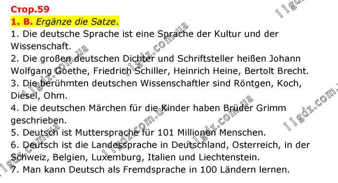 Стор.59 1. B. Ergänze die Satze. 1. Die deutsche Sprache ist eine Sprache der Kultur und der Wissenschaft. 2. Die großen deutschen Dichter und Schriftsteller heißen Johann Wolfgang Goethe, Friedrich Schiller, Heinrich Heine, Bertolt Brecht. 3. Die berühmten deutschen Wissenschaftler sind Röntgen, Koch, Diesel, Ohm. 4. Die deutschen Märchen für die Kinder haben Brüder Grimm geschrieben. 5. Deutsch ist Muttersprache für 101 Millionen Menschen. 6. Deutsch ist die Landessprache in Deutschland, Osterreich, in der Schweiz, Belgien, Luxemburg, Italien und Liechtenstein. 7. Man kann Deutsch als Fremdsprache in 100 Ländern lernen.