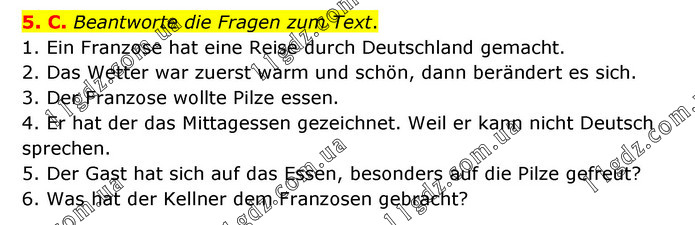 5. C. Beantworte die Fragen zum Text. 1. Ein Franzose hat eine Reise durch Deutschland gemacht. 2. Das Wetter war zuerst warm und schön, dann berändert es sich. 3. Der Franzose wollte Pilze essen. 4. Er hat der das Mittagessen gezeichnet. Weil er kann nicht Deutsch sprechen. 5. Der Gast hat sich auf das Essen, besonders auf die Pilze gefreut? 6. Was hat der Kellner dem Franzosen gebracht?