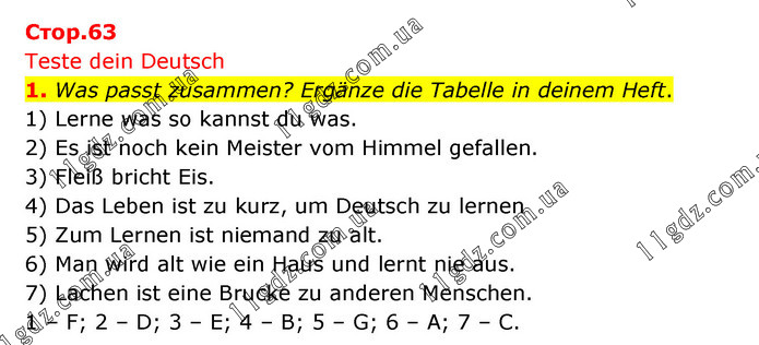 Стор.63 Teste dein Deutsch 1. Was passt zusammen? Ergänze die Tabelle in deinem Heft. 1) Lerne was so kannst du was. 2) Es ist noch kein Meister vom Himmel gefallen. 3) Fleiß bricht Eis. 4) Das Leben ist zu kurz, um Deutsch zu lernen 5) Zum Lernen ist niemand zu alt. 6) Man wird alt wie ein Haus und lernt nie aus. 7) Lachen ist eine Brucke zu anderen Menschen. 1 – F; 2 – D; 3 – E; 4 – B; 5 – G; 6 – A; 7 – C.