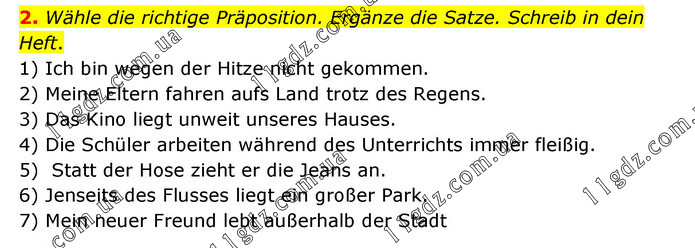 2. Wähle die richtige Präposition. Ergänze die Satze. Schreib in dein Heft. 1) Ich bin wegen der Hitze nicht gekommen. 2) Meine Eltern fahren aufs Land trotz des Regens. 3) Das Kino liegt unweit unseres Hauses. 4) Die Schüler arbeiten während des Unterrichts immer fleißig. 5) Statt der Hose zieht er die Jeans an. 6) Jenseits des Flusses liegt ein großer Park. 7) Mein neuer Freund lebt außerhalb der Stadt