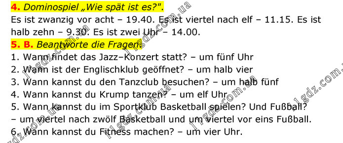 4. Dominospiel „Wie spät ist es?". Es ist zwanzig vor acht – 19.40. Es ist viertel nach elf – 11.15. Es ist halb zehn – 9.30. Es ist zwei Uhr – 14.00. 5. B. Beantworte die Fragen. 1. Wann findet das Jazz–Konzert statt? – um fünf Uhr 2. Wann ist der Englischklub geöffnet? – um halb vier 3. Wann kannst du den Tanzclub besuchen? – um halb fünf 4. Wann kannst du Krump tanzen? – um elf Uhr 5. Wann kannst du im Sportklub Basketball spielen? Und Fußball? – um viertel nach zwölf Basketball und um viertel vor eins Fußball. 6. Wann kannst du Fitness machen? – um vier Uhr.