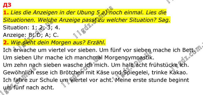 ДЗ 1. Lies die Anzeigen in der Ubung 5 a) noch einmal. Lies die Situationen. Welche Anzeige passt zu welcher Situation? Sag. Situation: 1; 2; 3; 4. Anzeige: B; D; A; C. 2. Wie sieht dein Morgen aus? Erzähl. Ich erwache um viertel vor sieben. Um fünf vor sieben mache ich Bett. Um sieben Uhr mache ich manchmal Morgengymnastik. Um zehn nach sieben wasche ich mich. Um halb acht frühstücke ich. Gewöhnlich esse ich Brötchen mit Käse und Spiegelei, trinke Kakao. Ich fahre zur Schule um viertel vor acht. Meine erste stunde beginnt um fünf nach acht.