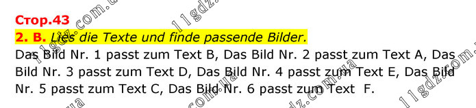 Стор.43 2. B. Lies die Texte und finde passende Bilder. Das Bild Nr. 1 passt zum Text B, Das Bild Nr. 2 passt zum Text A, Das Bild Nr. 3 passt zum Text D, Das Bild Nr. 4 passt zum Text E, Das Bild Nr. 5 passt zum Text C, Das Bild Nr. 6 passt zum Text F.