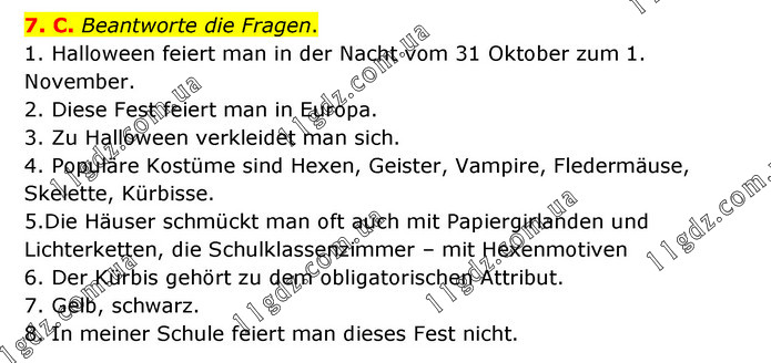 7. C. Beantworte die Fragen. 1. Halloween feiert man in der Nacht vom 31 Oktober zum 1. November. 2. Diese Fest feiert man in Europa. 3. Zu Halloween verkleidet man sich. 4. Populäre Kostüme sind Hexen, Geister, Vampire, Fledermäuse, Skelette, Kürbisse. 5.Die Häuser schmückt man oft auch mit Papiergirlanden und Lichterketten, die Schulklassenzimmer – mit Hexenmotiven 6. Der Kürbis gehört zu dem obligatorischen Attribut. 7. Gelb, schwarz. 8. In meiner Schule feiert man dieses Fest nicht.