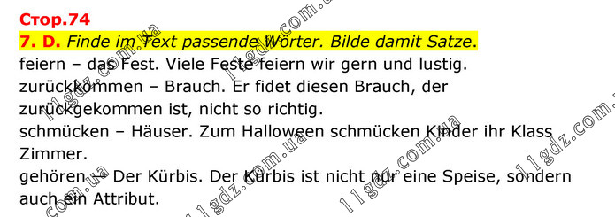 Стор.74 7. D. Finde im Text passende Wörter. Bilde damit Satze. feiern – das Fest. Viele Feste feiern wir gern und lustig. zurückkommen – Brauch. Er fidet diesen Brauch, der zurückgekommen ist, nicht so richtig. schmücken – Häuser. Zum Halloween schmücken Kinder ihr Klass Zimmer. gehören — Der Kürbis. Der Kürbis ist nicht nur eine Speise, sondern auch ein Attribut.
