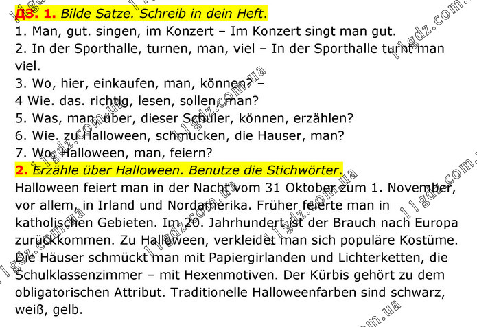 ДЗ. 1. Bilde Satze. Schreib in dein Heft. 1. Man, gut. singen, im Konzert – Im Konzert singt man gut. 2. In der Sporthalle, turnen, man, viel – In der Sporthalle turnt man viel. 3. Wo, hier, einkaufen, man, können? – 4 Wie. das. richtig, lesen, sollen, man? 5. Was, man, über, dieser Schuler, können, erzählen? 6. Wie. zu Halloween, schmucken, die Hauser, man? 7. Wo, Halloween, man, feiern? 2. Erzähle über Halloween. Benutze die Stichwörter. Halloween feiert man in der Nacht vom 31 Oktober zum 1. November, vor allem, in Irland und Nordamerika. Früher feierte man in katholischen Gebieten. Im 20. Jahrhundert ist der Brauch nach Europa zurückkommen. Zu Halloween, verkleidet man sich populäre Kostüme. Die Häuser schmückt man mit Papiergirlanden und Lichterketten, die Schulklassenzimmer – mit Hexenmotiven. Der Kürbis gehört zu dem obligatorischen Attribut. Traditionelle Halloweenfarben sind schwarz, weiß, gelb.