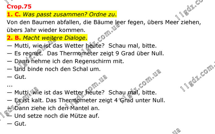 Стор.75 1. C. Was passt zusammen? Ordne zu. Von den Baumen abfallen, die Bäume leer fegen, übers Meer ziehen, übers Jahr wieder kommen. 2. B. Macht weitere Dialoge. — Mutti, wie ist das Wetter heute? Schau mal, bitte. — Es regnet. Das Thermometer zeigt 9 Grad über Null. — Dann nehme ich den Regenschirm mit. — Und binde noch den Schal um. — Gut. ... — Mutti, wie ist das Wetter heute? Schau mal, bitte. — Es ist kalt. Das Thermometer zeigt 4 Grad unter Null. — Dann ziehe ich den Mantel an. — Und setze noch die Mütze auf. — Gut.
