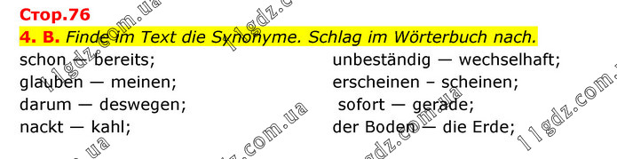 Стор.76 4. B. Finde im Text die Synonyme. Schlag im Wörterbuch nach. schon — bereits; glauben — meinen; darum — deswegen; nackt — kahl; unbeständig — wechselhaft; erscheinen – scheinen; sofort — gerade; der Boden — die Erde;