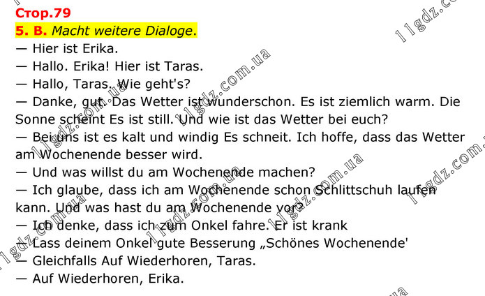 Стор.79 5. B. Macht weitere Dialoge. — Hier ist Erika. — Hallo. Erika! Hier ist Taras. — Hallo, Taras. Wie geht's? — Danke, gut. Das Wetter ist wunderschon. Es ist ziemlich warm. Die Sonne scheint Es ist still. Und wie ist das Wetter bei euch? — Bei uns ist es kalt und windig Es schneit. Ich hoffe, dass das Wetter am Wochenende besser wird. — Und was willst du am Wochenende machen? — Ich glaube, dass ich am Wochenende schon Schlittschuh laufen kann. Und was hast du am Wochenende vor? — Ich denke, dass ich zum Onkel fahre. Er ist krank — Lass deinem Onkel gute Besserung „Schönes Wochenende' — Gleichfalls Auf Wiederhoren, Taras. — Auf Wiederhoren, Erika.