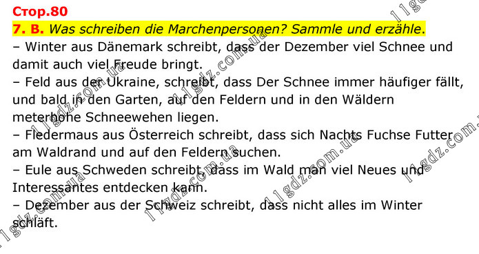 Стор.80 7. B. Was schreiben die Marchenpersonen? Sammle und erzähle. – Winter aus Dänemark schreibt, dass der Dezember viel Schnee und damit auch viel Freude bringt. – Feld aus der Ukraine, schreibt, dass Der Schnee immer häufiger fällt, und bald in den Garten, auf den Feldern und in den Wäldern meterhohe Schneewehen liegen. – Fledermaus aus Österreich schreibt, dass sich Nachts Fuchse Futter am Waldrand und auf den Feldern suchen. – Eule aus Schweden schreibt, dass im Wald man viel Neues und Interessantes entdecken kann. – Dezember aus der Schweiz schreibt, dass nicht alles im Winter schläft.