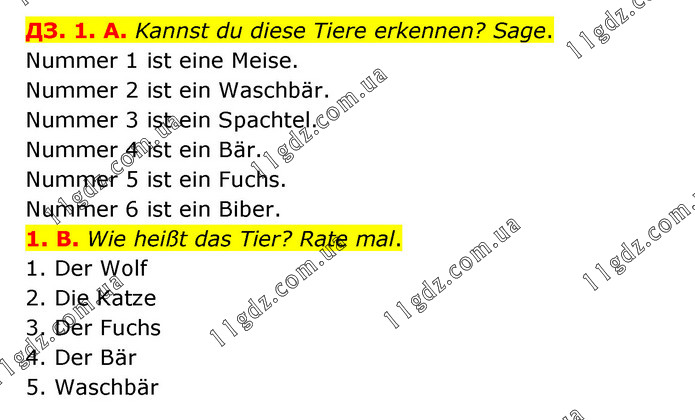 ДЗ. 1. A. Kannst du diese Tiere erkennen? Sage. Nummer 1 ist eine Meise. Nummer 2 ist ein Waschbär. Nummer 3 ist ein Spachtel. Nummer 4 ist ein Bär. Nummer 5 ist ein Fuchs. Nummer 6 ist ein Biber. 1. B. Wie heißt das Tier? Rate mal. 1. Der Wolf 2. Die Katze 3. Der Fuchs 4. Der Bär 5. Waschbär