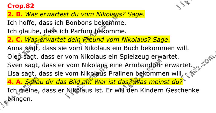 Стор.82 2. B. Was erwartest du vom Nikolaus? Sage. Ich hoffe, dass ich Bonbons bekomme. Ich glaube, dass ich Parfum bekomme. 2. C. Was erwartet dein Freund vom Nikolaus? Sage. Anna sagt, dass sie vom Nikolaus ein Buch bekommen will. Oleg sagt, dass er vom Nikolaus ein Spielzeug erwartet. Sven sagt, dass er vom Nikolaus eine Armbanduhr erwartet. Lisa sagt, dass sie vom Nikolaus Pralinen bekommen will. 4. A. Schau dir das Bild an. Wer ist das? Was meinst du? Ich meine, dass er Nikolaus ist. Er will den Kindern Geschenke bringen.