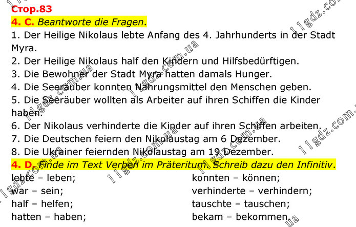 Стор.83 4. C. Beantworte die Fragen. 1. Der Heilige Nikolaus lebte Anfang des 4. Jahrhunderts in der Stadt Myra. 2. Der Heilige Nikolaus half den Kindern und Hilfsbedürftigen. 3. Die Bewohner der Stadt Myra hatten damals Hunger. 4. Die Seeräuber konnten Nahrungsmittel den Menschen geben. 5. Die Seeräuber wollten als Arbeiter auf ihren Schiffen die Kinder haben. 6. Der Nikolaus verhinderte die Kinder auf ihren Schiffen arbeiten. 7. Die Deutschen feiern den Nikolaustag am 6 Dezember. 8. Die Ukrainer feiernden Nikolaustag am 19 Dezember. 4. D. Finde im Text Verben im Präteritum. Schreib dazu den Infinitiv. lebte – leben; war – sein; half – helfen; hatten – haben; konnten – können; verhinderte – verhindern; tauschte – tauschen; bekam – bekommen.