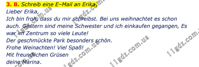 3. B. Schreib eine E–Mail an Erika. Lieber Erika, Ich bin froh, dass du mir schreibst. Bei uns weihnachtet es schon auch. Gestern sind meine Schwester und ich einkaufen gegangen, Es war im Zentrum so viele Leute! Der geschmückte Park besonders schön. Frohe Weinachten! Viel Spaß! Mit freundlichen Grüsen deine Marina.
