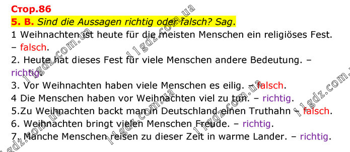 Стор.86 5. B. Sind die Aussagen richtig oder falsch? Sag. 1 Weihnachten ist heute für die meisten Menschen ein religiöses Fest. – falsch. 2. Heute hat dieses Fest für viele Menschen andere Bedeutung. – richtig. 3. Vor Weihnachten haben viele Menschen es eilig. – falsch. 4 Die Menschen haben vor Weihnachten viel zu tun. – richtig. 5.Zu Weihnachten backt man in Deutschland einen Truthahn – falsch. 6. Weihnachten bringt vielen Menschen Freude. – richtig. 7. Manche Menschen reisen zu dieser Zeit in warme Lander. – richtig.