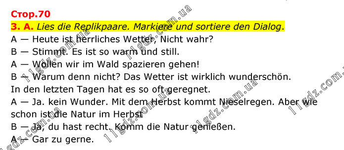 Стор.70 3. A. Lies die Replikpaare. Markiere und sortiere den Dialog. A — Heute ist herrliches Wetter, Nicht wahr? B — Stimmt. Es ist so warm und still. A — Wollen wir im Wald spazieren gehen! B — Warum denn nicht? Das Wetter ist wirklich wunderschön. In den letzten Tagen hat es so oft geregnet. A — Ja. kein Wunder. Mit dem Herbst kommt Nieselregen. Aber wie schon ist die Natur im Herbst B — Ja, du hast recht. Komm die Natur genießen. A — Gar zu gerne.