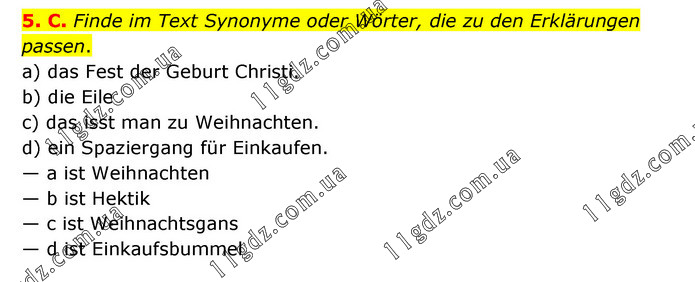 5. C. Finde im Text Synonyme oder Wörter, die zu den Erklärungen passen. a) das Fest der Geburt Christi. b) die Eile c) das isst man zu Weihnachten. d) ein Spaziergang für Einkaufen. — a ist Weihnachten — b ist Hektik — c ist Weihnachtsgans — d ist Einkaufsbummel