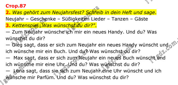 Стор.87 2. Was gehört zum Neujahrsfest? Schreib in dein Heft und sage. Neujahr – Geschenke – Süßigkeiten Lieder – Tanzen – Gäste 3. Kettenspiel „Was wünschst du dir?". — Zum Neujahr wünsche ich mir ein neues Handy. Und du? Was wünschst du dir? — Oleg sagt, dass er sich zum Neujahr ein neues Handy wünscht und ich wünsche mir ein Buch. Und du? Was wünschst du dir? — Max sagt, dass er sich zum Neujahr ein neues Buch wünscht und ich wünsche mir eine Uhr. Und du? Was wünschst du dir? — Lena sagt, dass sie sich zum Neujahr eine Uhr wünscht und ich wünsche mir Parfüm. Und du? Was wünschst du dir?