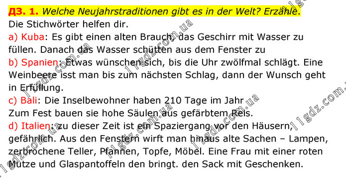 ДЗ. 1. Welche Neujahrstraditionen gibt es in der Welt? Erzähle. Die Stichwörter helfen dir. a) Kuba: Es gibt einen alten Brauch, das Geschirr mit Wasser zu füllen. Danach das Wasser schütten aus dem Fenster zu b) Spanien: Etwas wünschen sich, bis die Uhr zwölfmal schlägt. Eine Weinbeere isst man bis zum nächsten Schlag, dann der Wunsch geht in Erfüllung. c) Bali: Die Inselbewohner haben 210 Tage im Jahr Zum Fest bauen sie hohe Säulen aus gefärbtem Reis. d) Italien: zu dieser Zeit ist ein Spaziergang vor den Häusern, gefährlich. Aus den Fenstern wirft man hinaus alte Sachen – Lampen, zerbrochene Teller, Pfannen, Topfe, Möbel. Eine Frau mit einer roten Mutze und Glaspantoffeln den bringt. den Sack mit Geschenken.