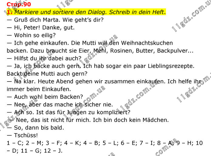 Стор.90 1. Markiere und sortiere den Dialog. Schreib in dein Heft. — Gruß dich Marta. Wie geht’s dir? — Hi, Peter! Danke, gut. — Wohin so eilig? — Ich gehe einkaufen. Die Mutti will den Weihnachtskuchen backen. Dazu braucht sie Eier, Mehl, Rosinen, Butter, Backpulver... — Hilfst du ihr dabei auch? — Ja, ich backe auch gern. Ich hab sogar ein paar Lieblingsrezepte. Backt deine Mutti auch gern? — Na klar. Heute Abend gehen wir zusammen einkaufen. Ich helfe ihr immer beim Einkaufen. — Auch wohl beim Backen? — Nee, aber das mache ich sicher nie. — Ach so. Ist das für Jungen zu kompliziert? — Nee, das ist nicht für mich. Ich bin doch kein Mädchen. — So, dann bis bald. — Tschüss! 1 – C; 2 – M; 3 – F; 4 – K; 4 – B; 5 – L; 6 – E; 7 – I; 8 – A; 9 – H; 10 – D; 11 – G; 12 – J.