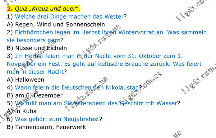 2. Quiz „Kreuz und quer". 1) Welche drei Dinge machen das Wetter? A) Regen, Wind und Sonnenschein 2) Eichhörnchen legen im Herbst ihren Wintervorrat an. Was sammeln sie besonders gern? B) Nüsse und Eicheln 3) Im Herbst feiert man in der Nacht vom 31. Oktober zum 1. November ein Fest. Es geht auf keltische Brauche zurück. Was feiert man in dieser Nacht? A) Halloween 4) Wann feiern die Deutschen den Nikolaustag? B) am 6. Dezember 5) Wo füllt man am Silvesterabend das Geschirr mit Wasser? A) in Kuba 6) Was gehört zum Neujahrsfest? B) Tannenbaum, Feuerwerk