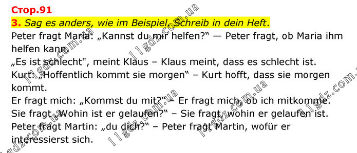 3. Sag es anders, wie im Beispiel. Schreib in dein Heft. Peter fragt Maria: „Kannst du mir helfen?“ — Peter fragt, ob Maria ihm helfen kann. „Es ist schlecht", meint Klaus – Klaus meint, dass es schlecht ist. Kurt: „Hoffentlich kommt sie morgen“ – Kurt hofft, dass sie morgen kommt. Er fragt mich: „Kommst du mit?“ – Er fragt mich, ob ich mitkomme. Sie fragt „Wohin ist er gelaufen?“ – Sie fragt, wohin er gelaufen ist. Peter fragt Martin: „du dich?“ – Peter fragt Martin, wofür er interessierst sich.