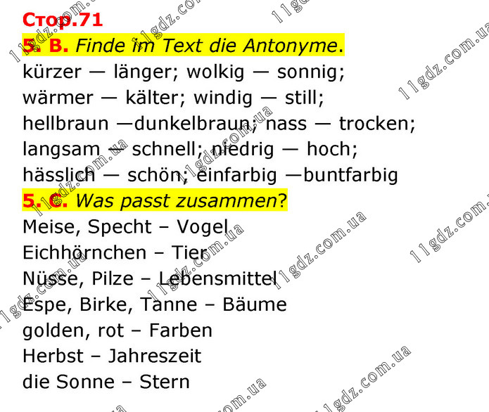 Стор.71 5. B. Finde im Text die Antonyme. kürzer — länger; wolkig — sonnig; wärmer — kälter; windig — still; hellbraun —dunkelbraun; nass — trocken; langsam — schnell; niedrig — hoch; hässlich — schön; einfarbig —buntfarbig 5. C. Was passt zusammen? Meise, Specht – Vogel Eichhörnchen – Tier Nüsse, Pilze – Lebensmittel Espe, Birke, Tanne – Bäume golden, rot – Farben Herbst – Jahreszeit die Sonne – Stern