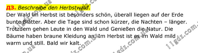 ДЗ. Beschreibe den Herbstwald. Der Wald im Herbst ist besonders schön, überall liegen auf der Erde bunte Blätter. Aber die Tage sind schon kürzer, die Nachten – länger. Trotzdem gehen Leute in den Wald und Genießen die Natur. Die Bäume haben braune Kleidung an. Im Herbst ist es im Wald mild warm und still. Bald wir kalt.