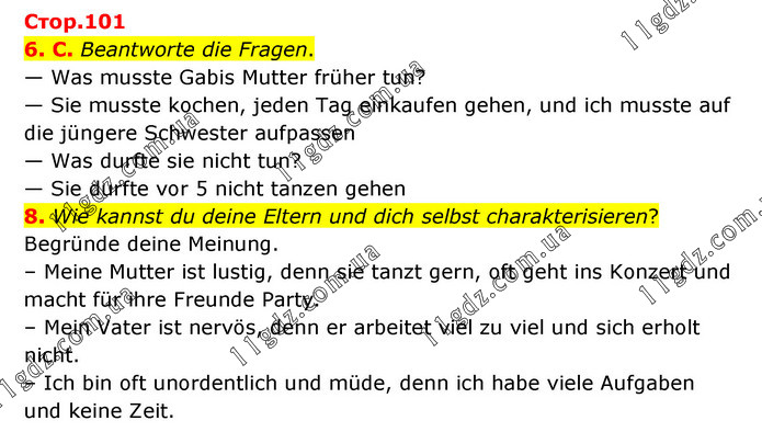 Стор.101 6. С. Beantworte die Fragen. — Was musste Gabis Mutter früher tun? — Sie musste kochen, jeden Tag einkaufen gehen, und ich musste auf die jüngere Schwester aufpassen — Was durfte sie nicht tun? — Sie durfte vor 5 nicht tanzen gehen 8. Wie kannst du deine Eltern und dich selbst charakterisieren? Begründe deine Meinung. – Meine Mutter ist lustig, denn sie tanzt gern, oft geht ins Konzert und macht für ihre Freunde Party. – Mein Vater ist nervös, denn er arbeitet viel zu viel und sich erholt nicht. – Ich bin oft unordentlich und müde, denn ich habe viele Aufgaben und keine Zeit.