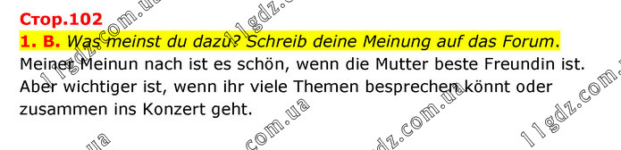 Стор.102 1. B. Was meinst du dazu? Schreib deine Meinung auf das Forum. Meiner Meinun nach ist es schön, wenn die Mutter beste Freundin ist. Aber wichtiger ist, wenn ihr viele Themen besprechen könnt oder zusammen ins Konzert geht.
