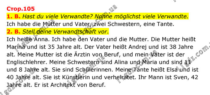 Стор.105 1. B. Hast du viele Verwandte? Nonne möglichst viele Verwandte. Ich habe die Mutter und Vater, zwei Schwestern, eine Tante. 2. B. Stell deine Verwandtschaft vor. Ich heiße Anna. Ich habe den Vater und die Mutter. Die Mutter heißt Marina und ist 35 Jahre alt. Der Vater heißt Andrej und ist 38 Jahre alt. Meine Mutter ist die Ärztin von Beruf, und mein Vater ist der Englischlehrer. Meine Schwestern sind Alina und Maria und sind 11 und 8 Jahre alt. Sie sind Schülerinnen. Meine Tante heißt Elsa und ist 40 Jahre alt. Sie ist Künstlerin und verheiratet. Ihr Mann ist Sven, 42 Jahre alt. Er ist Architekt von Beruf.