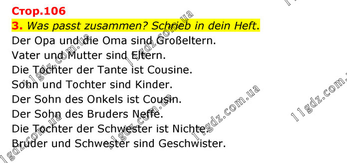 3. Was passt zusammen? Schrieb in dein Heft. Der Opa und die Oma sind Großeltern. Vater und Mutter sind Eltern. Die Tochter der Tante ist Cousine. Sohn und Tochter sind Kinder. Der Sohn des Onkels ist Cousin. Der Sohn des Bruders Neffe. Die Tochter der Schwester ist Nichte. Bruder und Schwester sind Geschwister.