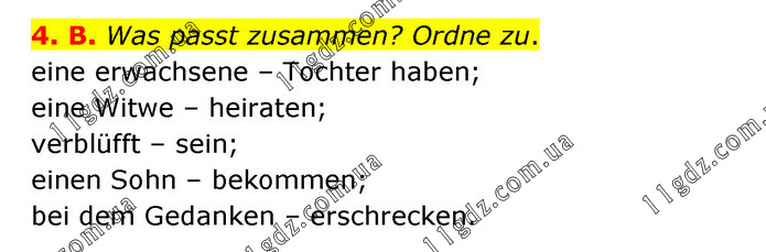 4. B. Was passt zusammen? Ordne zu. eine erwachsene – Tochter haben; eine Witwe – heiraten; verblüfft – sein; einen Sohn – bekommen; bei dem Gedanken – erschrecken.
