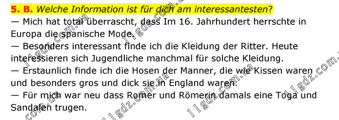 5. B. Welche Information ist für dich am interessantesten? — Mich hat total überrascht, dass Im 16. Jahrhundert herrschte in Europa die spanische Mode. — Besonders interessant finde ich die Kleidung der Ritter. Heute interessieren sich Jugendliche manchmal für solche Kleidung. — Erstaunlich finde ich die Hosen der Manner, die wie Kissen waren und besonders gros und dick sie in England waren. — Für mich war neu dass Romer und Römerin damals eine Toga und Sandalen trugen.