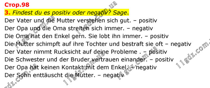 Стор.98 3. Findest du es positiv oder negativ? Sage. Der Vater und die Mutter verstehen sich gut. – positiv Der Opa und die Oma streiten sich immer. – negativ Die Oma hat den Enkel gern. Sie lobt ihn immer. – positiv Die Mutter schimpft auf ihre Tochter und bestraft sie oft – negativ Der Vater nimmt Rucksicht auf deine Probleme . – positiv Die Schwester und der Bruder vertrauen einander. – positiv Der Opa hat keinen Kontakt mit dem Enkel. – negativ Der Sohn enttäuscht die Mutter. – negativ