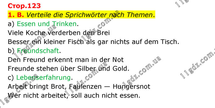 1. B. Verteile die Sprichwörter nach Themen. a) Essen und Trinken. Viele Koche verderben den Brei Besser ein kleiner Fisch als gar nichts auf dem Tisch. b) Freundschaft. Den Freund erkennt man in der Not Freunde stehen über Silber und Gold. c) Lebenserfahrung. Arbeit bringt Brot, Faulenzen — Hungersnot Wer nicht arbeitet, soll auch nicht essen.