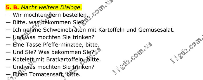 5. B. Macht weitere Dialoge. — Wir mochten gern bestellen. — Bitte, was bekommen Sie? — Ich nehme Schweinebraten mit Kartoffeln und Gemüsesalat. — Und was mochten Sie trinken? — Eine Tasse Pfefferminztee, bitte. — Und Sie? Was bekommen Sie? — Kotelett mit Bratkartoffeln, bitte. — Und was mochten Sie trinken? — Einen Tomatensaft, bitte.