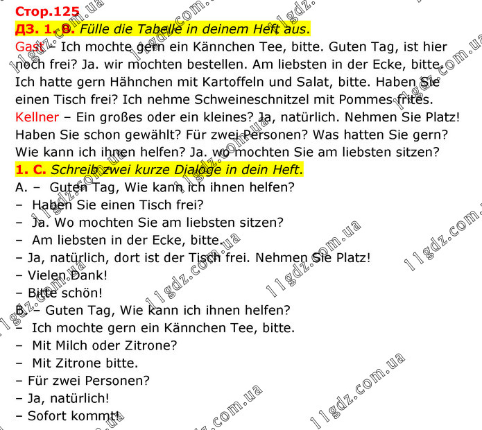 ДЗ. 1. B. Fülle die Tabelle in deinem Heft aus. Gast – Ich mochte gern ein Kännchen Tee, bitte. Guten Tag, ist hier noch frei? Ja. wir mochten bestellen. Am liebsten in der Ecke, bitte. Ich hatte gern Hähnchen mit Kartoffeln und Salat, bitte. Haben Sie einen Tisch frei? Ich nehme Schweineschnitzel mit Pommes frites. Kellner – Ein großes oder ein kleines? Ja, natürlich. Nehmen Sie Platz! Haben Sie schon gewählt? Für zwei Personen? Was hatten Sie gern? Wie kann ich ihnen helfen? Ja. wo mochten Sie am liebsten sitzen? 1. C. Schreib zwei kurze Dialoge in dein Heft. A. – Guten Tag, Wie kann ich ihnen helfen? – Haben Sie einen Tisch frei? – Ja. Wo mochten Sie am liebsten sitzen? – Am liebsten in der Ecke, bitte. – Ja, natürlich, dort ist der Tisch frei. Nehmen Sie Platz! – Vielen Dank! – Bitte schön! B. – Guten Tag, Wie kann ich ihnen helfen? – Ich mochte gern ein Kännchen Tee, bitte. – Mit Milch oder Zitrone? – Mit Zitrone bitte. – Für zwei Personen? – Ja, natürlich! – Sofort kommt!