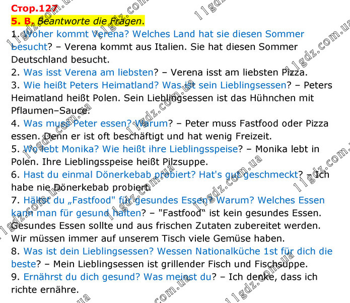 5. B. Beantworte die Fragen. 1. Woher kommt Verena? Welches Land hat sie diesen Sommer Ьesucht? – Verena kommt aus Italien. Sie hat diesen Sommer Deutschland besucht. 2. Was isst Verena am liebsten? – Verena isst am liebsten Pizza. 3. Wie heißt Peters Heimatland? Was ist sein Lieblingsessen? – Peters Heimatland heißt Polen. Sein Lieblingsessen ist das Hühnchen mit Pflaumen–Sauce. 4. Was muss Peter essen? Warum? – Peter muss Fastfood oder Pizza essen. Denn er ist oft beschäftigt und hat wenig Freizeit. 5. Wo lebt Monika? Wie heißt ihre Lieblingsspeise? – Monika lebt in Polen. Ihre Lieblingsspeise heißt Pilzsuppe. 6. Hast du einmal Dönerkebab probiert? Hat's gut geschmeckt? – Ich habe nie Dönerkebab probiert. 7. Hältst du „Fastfood" für gesundes Essen? Warum? Welches Essen kann man für gesund halten? – "Fastfood“ ist kein gesundes Essen. Gesundes Essen sollte und aus frischen Zutaten zubereitet werden. Wir müssen immer auf unserem Tisch viele Gemüse haben. 8. Was ist dein Lieblingsessen? Wessen Nationalküche 1st für dich die beste? – Mein Lieblingsessen ist grillender Fisch und Fischsuppe. 9. Ernährst du dich gesund? Was meinst du? – Ich denke, dass ich richte ernähre.